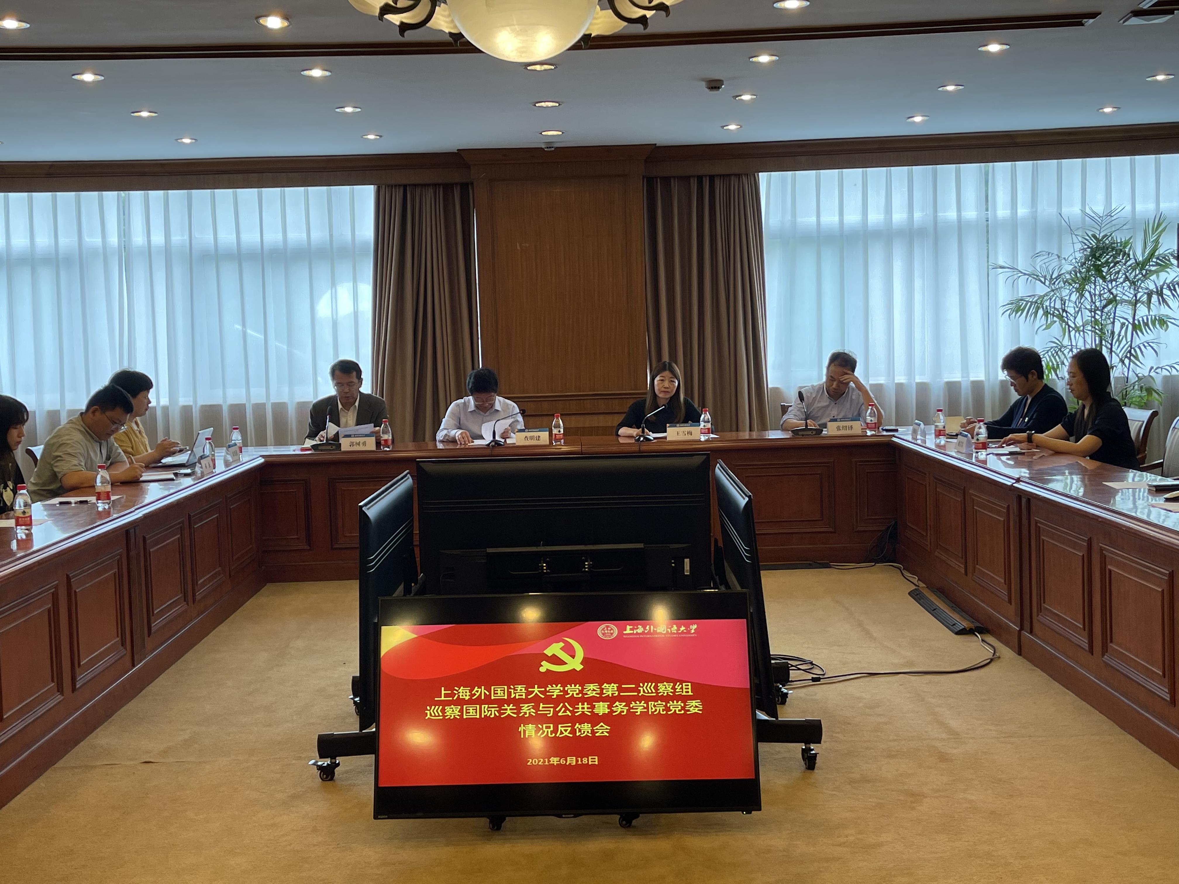根据校党委统一部署,近日,上海外国语大学党委第二巡察组向国际关系与公共事务学院党委反馈巡察情况。2021年6月9日,上海外国语大学党委第二巡察组组长王雪梅向党委书记张绍铎、院长郭树勇进行个别反馈,会上校党委副书记、纪委书记、巡察工作领导小组副组长钱玲传达校党委指示精神并开展全面从严治党工作谈话。2021年6月18日,王雪梅代表上海外国语大学党委第二巡察组进行大会反馈。联系校领导查明建副校长传达校党委指示精神并对巡察整改工作提出要求。张绍铎作表态发言,郭树勇主持会议。