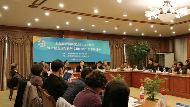 召开学术会议。(1)2016年8月,在G20峰会(杭州)召开前夕,“使全球治理更加有效和包容:二十国集团与联合国”国际研讨会召开,来自中国、美国、加拿大、澳大利亚、印尼、比利时等国的30多位专家与来自国内的50余位学者,就G20的时代任务、发展目标及面临的难题展开讨论,引起了广泛的社会影响,有力地配合国家的主场外交行动,《解放日报》整版报道了此次国际会议,国际权威网站多伦多大学G20研究中心网站也做报道。(2)2016年11月,“中国学的国际对话:方法与体系”国际学术研讨会召开,来自5大洲10个国家的近50位学者参会,探讨了中国深入参与全球治理新形势下,如何讲好中国故事,发出中国声音,传播中国方案,提高中国话语权,促进中外人文交流。(3)2016年12月,上海联合国研究会2016年年会暨“联合国与世界文明对话”学术研讨会召开。来自全国各地的50名专家学者聚集上外,围绕联合国的作用、文明对话的理论与方法、世界文明对话的近期进展、上海世博会与文明对话、全球文化治理、中国公共外交等议题进行了深入研讨。