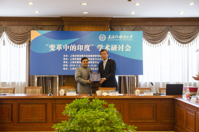 2018年11月9日,由上海外国语大学全球治理与区域国别研究院主办、国际关系与公共事务学院协办、印度研究中心承办的“变革中的印度”研讨会在上海外国语大学举行。来自上海国际问题研究院、中山大学、武汉大学、华东理工大学、复旦大学、上海对外经贸大学、国家发改委、上海社科院、中国社会科学院、海南亚太研究院的专家,我校印度研究中心的首席顾问吴永年教授,陈金英副教授,Indira Ravindran 及印度语专业教师章雨桐老师就当前印度经济、政治、社会及对外政策等领域发生的变革进行了研讨。上海外国语大学党委书记姜锋博士出席了开幕式,并就印度研究的重要性及未来研究领域做出了指示。印度驻上海总领事馆对此次聚焦于印度自身发展的研讨会也给予了大力支持。印度驻上海总领事馆总领事瑞峰先生出席了研讨会的开幕式并向我校印度研究中心赠送了书籍和研究资料。