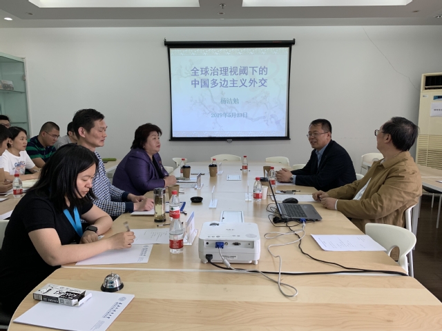 5月23日下午,上海市国际关系学会会长、新时代中国外交研究中心名誉主任杨洁勉教授应上海外国语大学新时代中国外交研究中心邀请,在上外虹口校区作题为“全球治理视阈下的中国多边主义外交”的专题报告。中心常务副主任、上外国关学院院长郭树勇教授致辞,中心副主任于朝晖教授主持专家学者交流讨论。程亚文教授、王联合教授等上外教师及博士生20余人参加学习研讨。